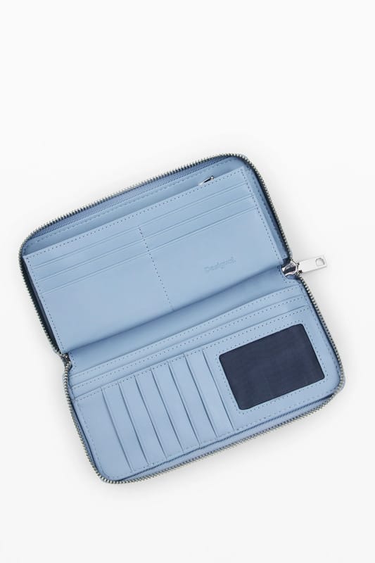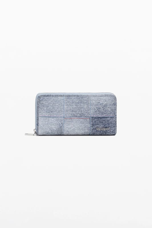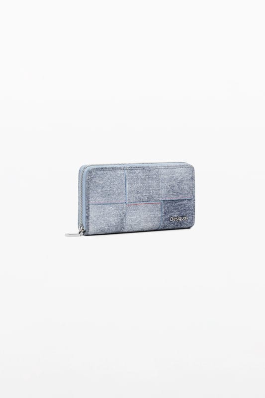 - Billetero en tejido efecto piel trenzado con cierre de cremallera y estampado efecto denim.