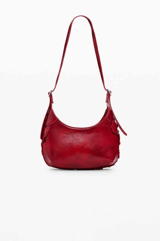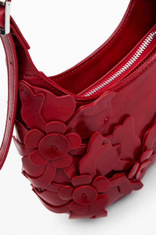 - Bolso de hombro de tamaño pequeño, en efecto piel de color rojo con acabado brillante, apliques en forma de flor y cierre de cremallera.