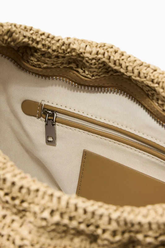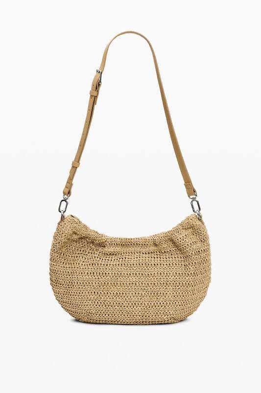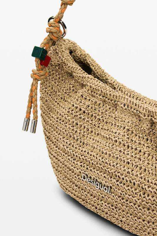 Bolso mediano de rafia con forma ovalada, correas intercambiables, detalle de charms con tarjetero y etiqueta con logo bordado en efecto piel.