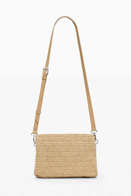 Bolso mediano de rafia con forma rectangular, solapa, correas intercambiables, detalle de charms con tarjetero y logo bordado en efecto piel.