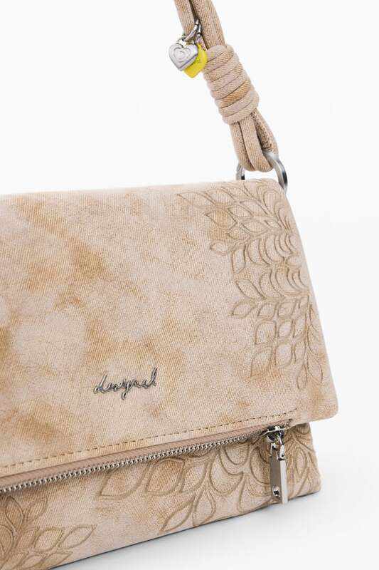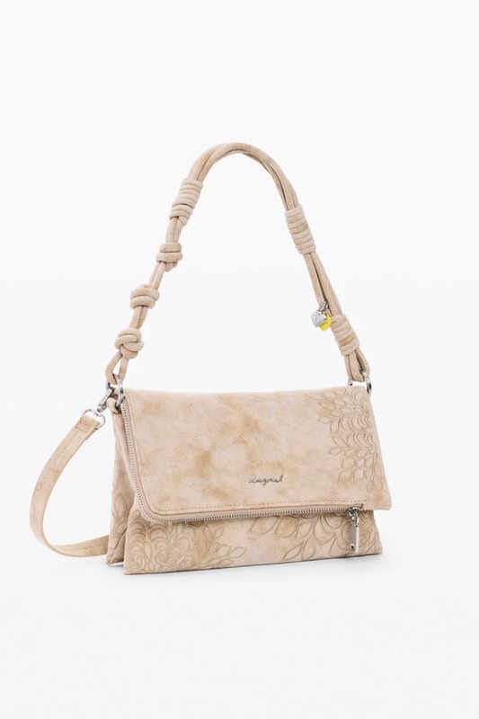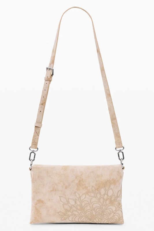 Bolso mediano de solapa, con detalles bordados, bolsillo interior con cremallera, logo metálico grabado y correas intercambiables.
