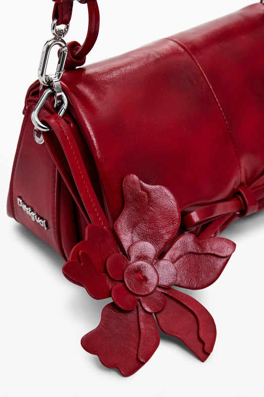 - Bolso pequeño estilo bandolera en efecto piel, con acabado brillante, detalle de lazo, asas intercambiables y llavero extraíble.