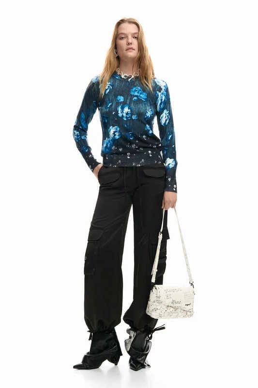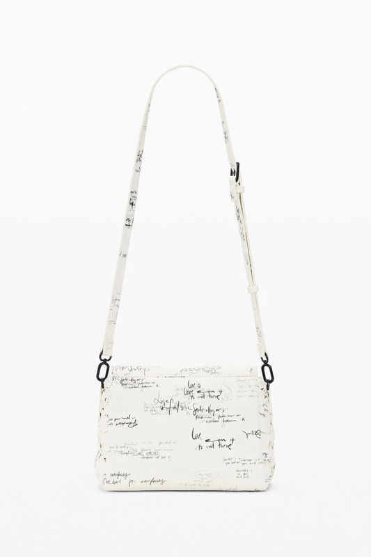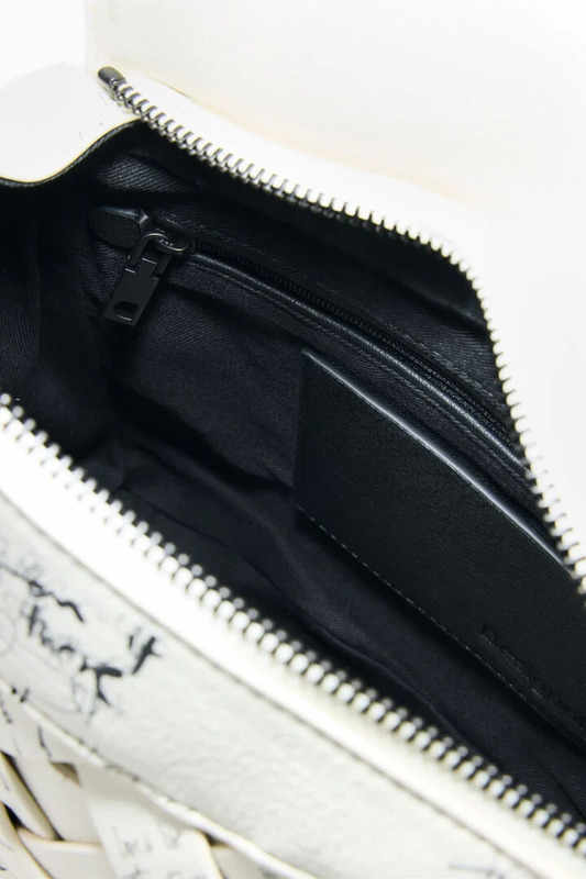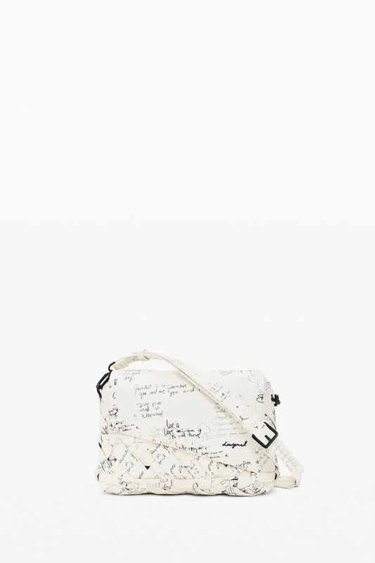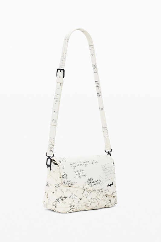 - Bolso mediano con solapa, detalles trenzados, estampado de estilo lettering, correas intercambiables y solapa.