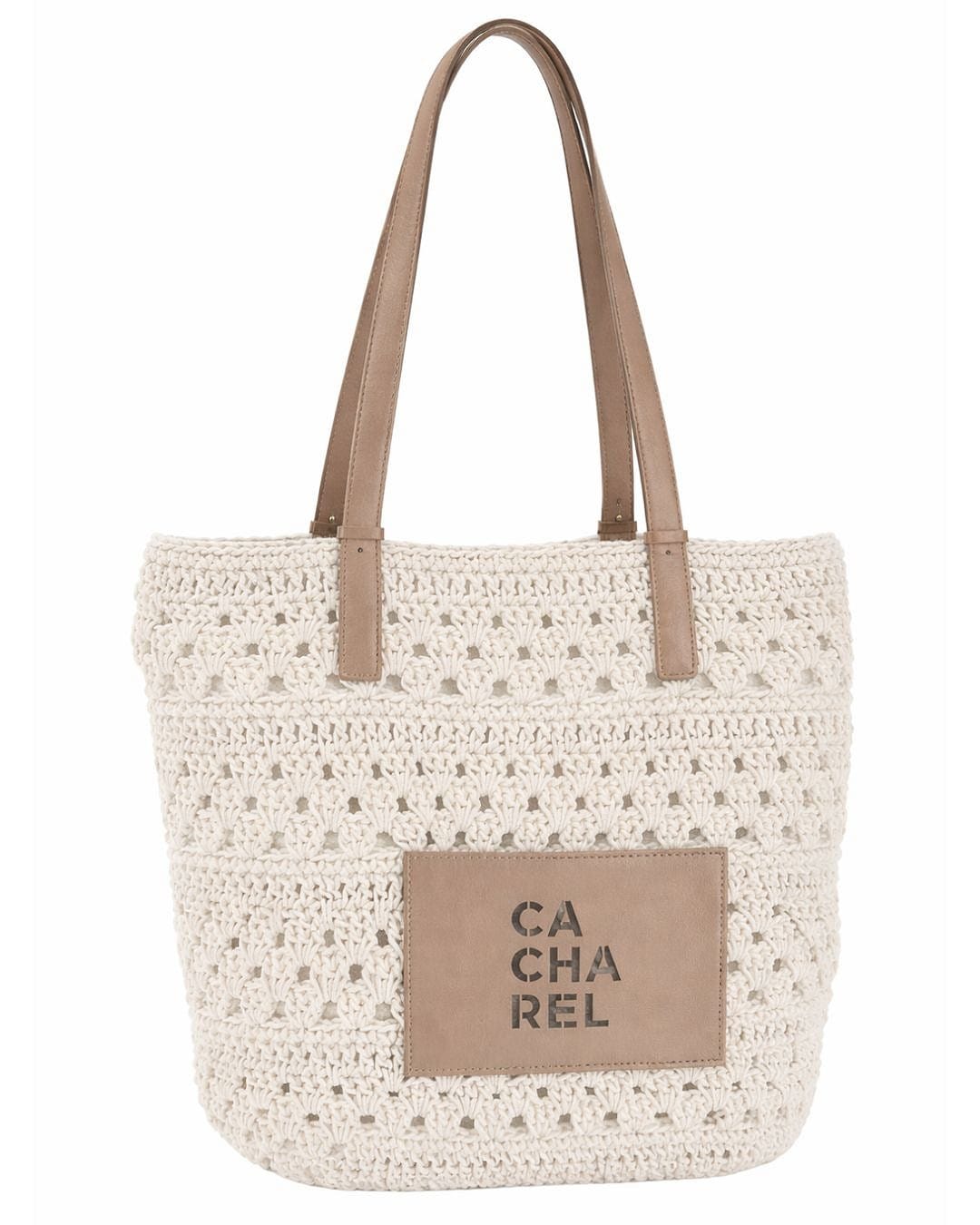 - Incorpora asas largas en acabado color cuero, resistentes y cómodas para llevar al hombro. En el frontal presenta un parche con el logotipo CACHAREL en el mismo tono cuero, que añade un contraste elegante y refuerza su identidad de marca.