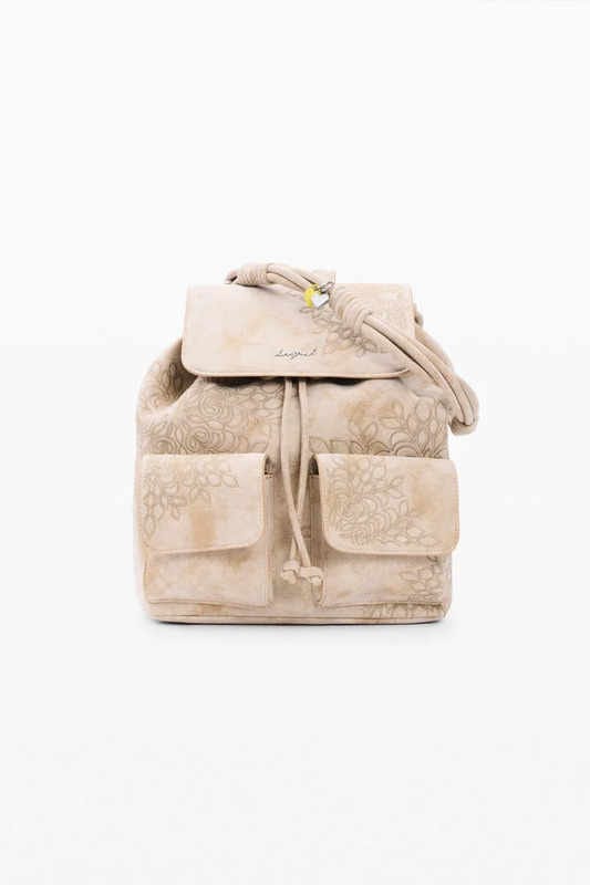 Mochila pequeña con detalles bordados, solapa, bolsillos delanteros con cierre magnético y bolsillo trasero con cremallera.