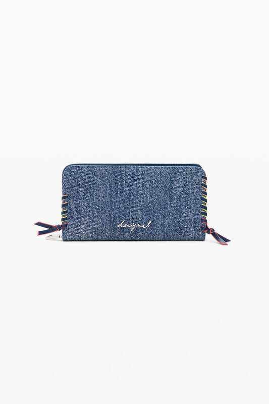 Monedero mediana en tejido denim, con detalles trenzados en los bordes y aplique de logo metálico.